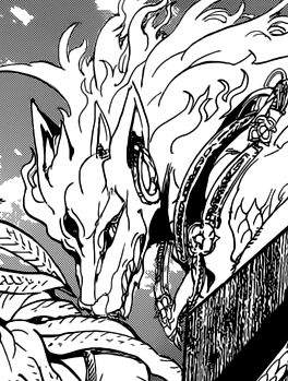 Agares resembles a fox, having crocodilian scales as skin.[1] Like all the Djinn, Agares has a third eye in his forehead.