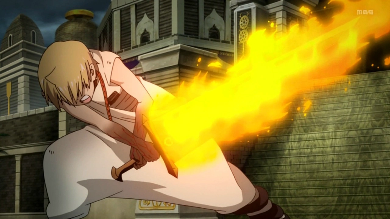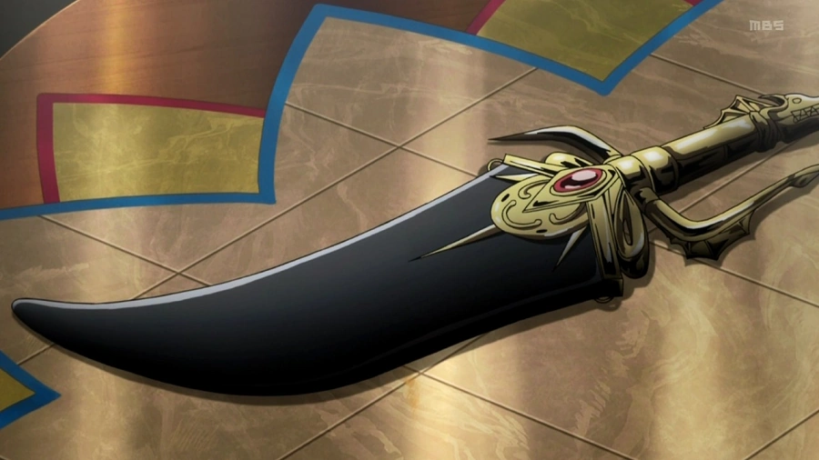 Amol Saiqa (アモンの剣, Amōru.Saika, lit. Amon's Sword) is the Metal Vessel of Alibaba Saluja. It gets its power from Alibaba's Djinn, Amon. It has the ability to generate Heat Magic and absorbs fire. It also has immense cutting power, as it can cut just about anything. Alibaba's Djinn Equip has evolved to the point to where he can Equip his arms too. After Alibaba's first Metal Vessel broke, he transferred Amon to a short curved sword and learns how to use a second Djinn Weapon Equip form, Amon's Royal Sword.
