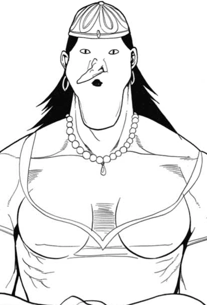 Elizabeth is a tall woman of muscular build with irregular face. She has small eyes and mouth, but a huge nose. Her hair is long. She wears a necklace and earrings.