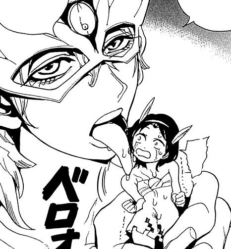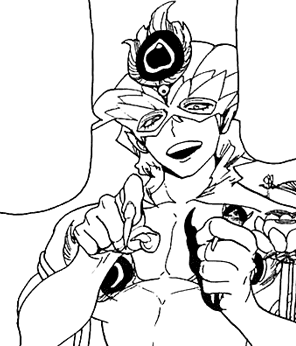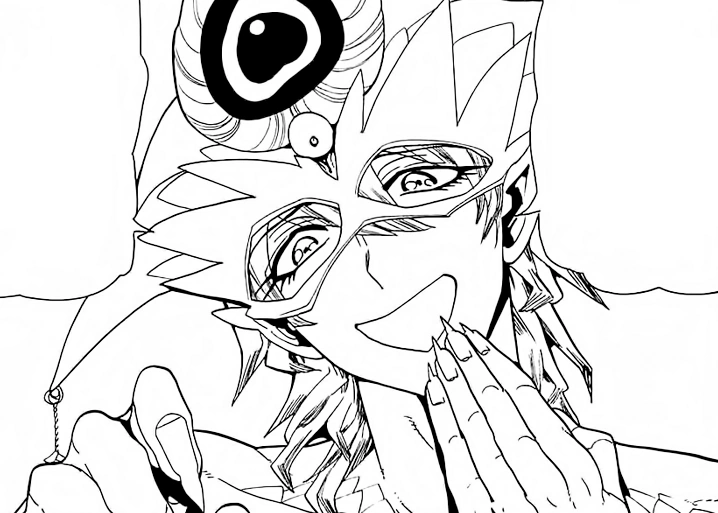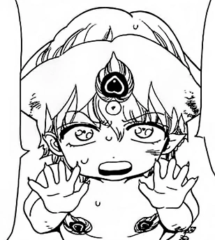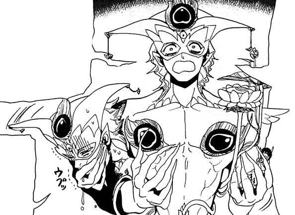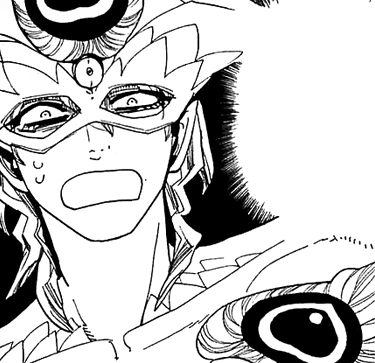 After the group reunites, Fake Zagan appears again with a bright smile. He comments that they're doing pretty good. He says that they're really strong and he started to admire them. He then adds that there's one person who is unreliable and drags them down. He addresses to that person that he can't pretend that he doesn't hear him, pointing at the guy with a scar on his face. He laughs at Hakuryuu, reminding him that the rest has been helping him from the start and is bother to them. He wonders if he is qualified to be their comrade, as he can't do anything and is such a weakling. Much to his astonishment, Hakuryuu starts crying. He tries to barely smile and, still confused, asks if he made the weakling cry, but Hakuryuu shouts at him to shut up, calling him stupid masked pervert and leaving him without the ability to response.[9]