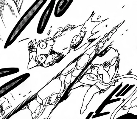 Zagan and his duplicates fight against the group. Every time Alibaba slashes it, he restores himself thanks to nutrients in the soil of the Dungeon. He hurts Alibaba and Hakuryuu, so Aladdin and Morgiana want to retreat. Fake Zagan however opens a hole in the ground and makes them fall into it, waving his hand as a goodbye. Morgiana wonders what it is below, so he explains that it's his real body and once they fall in his mouth, his gastric juices will make them vanish in a second. Much to his surprise, the group is able to get out of there. Morgiana jumps off to go and defeat Fake Zagan all by herself. He laughs at her, wondering if she has lost her mind. He comments that they get out by a fluke and can't believe that she still wants to do that. He warns her that he will change into a skewer and then eat her. He watches Morgiana's moves and comments them. As she reaches his real body, he asks her how is she going to defeat it with her pathetic kicks and stupid chains. She chains the mouth of the monster and then burns it with Amol Selseila.[12]
