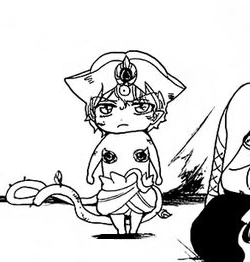 Fake Zagan first appears playing a music behind the giant bear, who encountered Alibaba Saluja, Aladdin, Morgiana and Hakuryuu Ren. He makes the monster much more aggressive.[1] Later, when Alibaba promises Tiare that they will successfully leave the Dungeon, Zagan appears on a leaf, which is located much higher than the group, saying that he will not let them. He the pats the head of his monsters and asks if they're alright. He then addresses the group, telling them to do him a favor and not bully his little bears. As he says that, he welcomes them to his stylish Dungeon and introduces himself as the 61st Djinn, Zagan. He picks up Tiare and realizes that she's only an ordinary girl from the village whom he didn't bring there. When Hakuryuu orders him to stop, Zagan licks Tiare's face. He turns her upside down and wonders where is she the most delicious.[2]