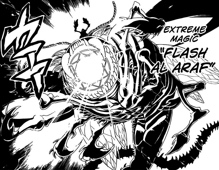 Flash Al-Alaf (焼夷光葬砲Furāshu Aru Arāfu, "Incendiary Light Cannon") is the Extreme Magic of Apollonius, Dark Djinn Equip form. Apollonius creates an even bigger and beastly version of Al-Flash Habaheb, with him on top. Out of its mouth is a huge Metal Vessel symbol. He shoots huge rays out of his mouth at his opponents.