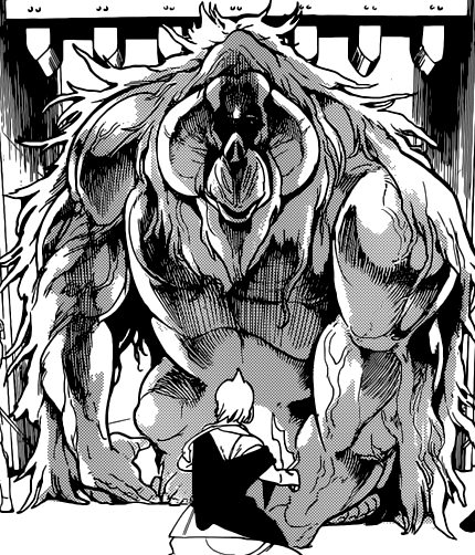 Garda releases Alibaba and lets him escape, Garda then goes straight for him, breaking a statue. Garda decides to eat his arm, however Alibaba used the spear, the statue was holding, to pierce Garda's mouth. Garda then proceeds to stomp Alibaba, but was lured in by Alibaba to be stabbed by his sword, by using the wall as support. With the loss of one arm, Garda was slashed by Alibaba several times until Garda couldn't fight anymore.[7]