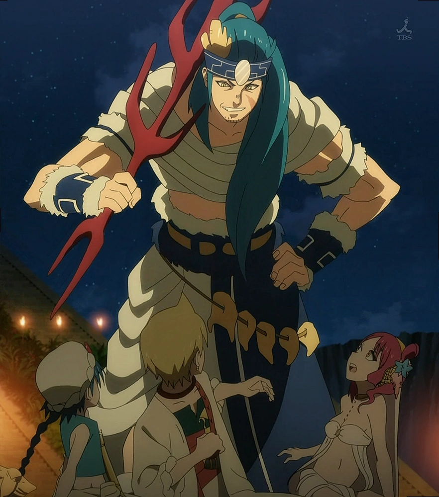 When one of the Southern Creatures attacks Sindria, he stands alongside the rest of the Eight Generals and watches as Sharrkan defeats it. Then, he is present during the introduction of Alibaba Saluja to Sharrkan, but talks with someone.[9] During the Mahrajan Festival, he takes a toast with the Eight Generals such as Ja'far, Drakon, Masrur and Sharrkan, but also with Sinbad and Alibaba. He is officially introduced to Alibaba, Aladdin and Morgiana by Sinbad. He appears out of nowhere, asking if Sinbad called for him. He is there with his children, who ask him if they can drink alcohol, to which he doesn't agree. When Drakon asks Sinbad if he's ever going to change his mind and marry a woman, Hinahoho says that he's right, as it's good to have brats around and advises Sinbad to have a lot of them.[10]
