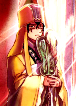 Koubun Ka is a tall man with black wavy hair tied back and yellow eyes. He has markings on his face. He wears a tall hat, with traditional and wealthy looking clothes. He carries around his Household Vessel, which takes the appearance of a green fan.