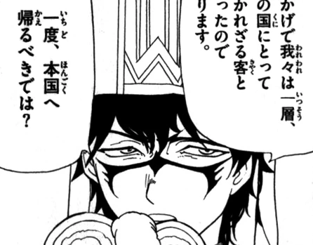 When Judar comes to infiltrate Sindria, Koubun assists Kougyoku when she goes to see him. He realizes that they've been surrounded by Sindria's citizens and looks annoyed about this fact. He has the same expression when Judar leaves after the talk with the Princess.[15]
