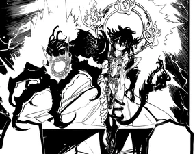 Kouen is with Alibaba watching, and proudly says to Alibaba that their younger siblings are brave and offers Alibaba to restore his arm with Phenex's abilities. Alibaba then asks Kouen if Hakuryuu will come. Kouen answers that he doesn't know as he doesn't know whether Hakuryuu follows his orders or not. After saying that, Kouen equips Astaroth again and says that it's not time to worry about other people, they have have to move as well. All the Dungeon Capturers and Aladdin attack again, but the doll begins to steal Rukh from the sea and becomes bigger.[36]