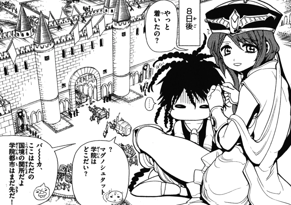 After the fight, back on the caravan, Kouha asks who the dirty brat, Aladdin, was. One of his attendants says Aladdin has been traveling with them for a while now. When Aladdin realizes that they are traveling to Magnostadt, Kouha informs Aladdin that only special exceptions like him and Magic Users can enter. Aladdin says he's a Magician and he's going there to study. The driver of Kouha's cart informs him that they will arrive in 9 days. Eight days later, Kouha dropped Aladdin off at the Magician's entrance into the capital. Kouha tells Aladdin that he will have someone pick him up there and wishes him good luck.[12]