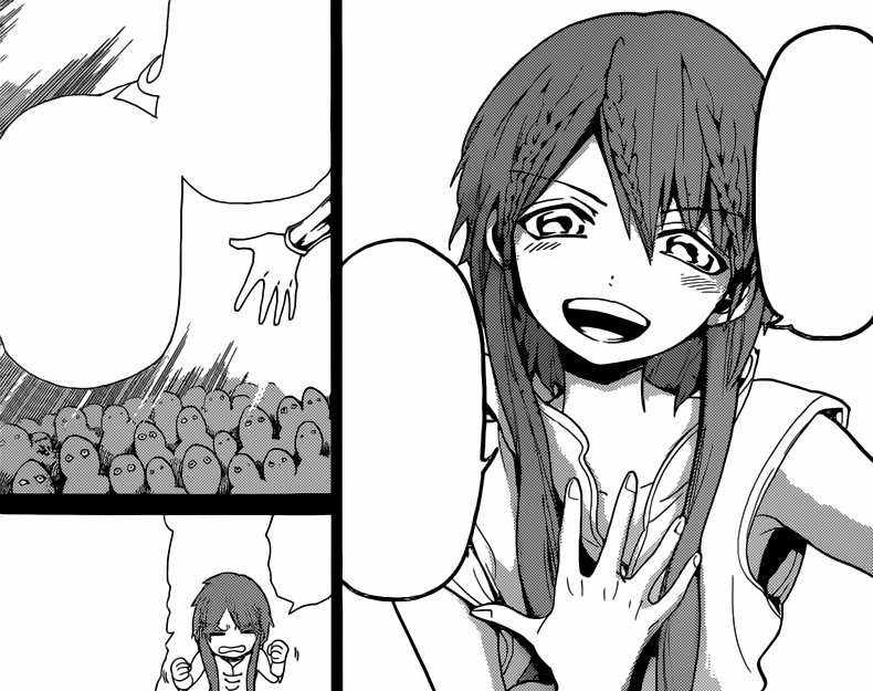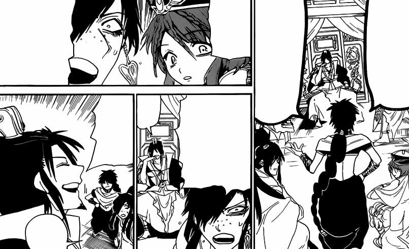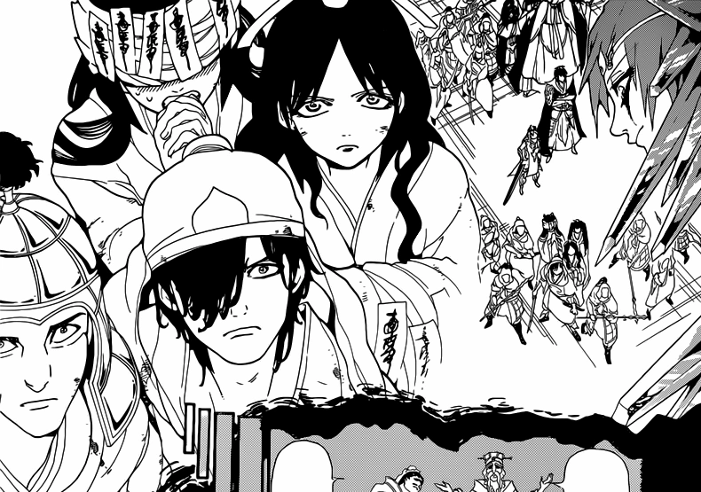 Kouha is obviously tired, and his Magician Attendants note that he is running out of Magoi, and say that they will give Kouha's Metal Vessel the 7th Type of Magic until they run out. As the male member of Kouha's army expressed his relief that the Black Djinn were annihilated, the Black Rukh leaves, which makes Kouha's Magician Attendants wonder their destination. After a while, an army of bigger Black Djinn appear.[23]