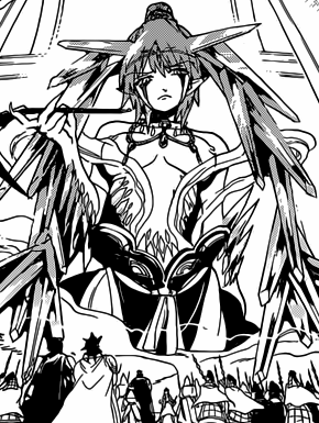 After Aladdin summons Kouen's Djinn, Agares, Astaroth and Phenex, he also summons Amon and Leraje. The five Djinn ask the Magi if he summoned them. Leraje, along with the other Djinn, listens while Amon explains the situation and after his speech she begs to the Dungeon Capturers to don't let this world die or else it'll be the same as Alma Torran. Astaroth cuts her off since the humans of these world shouldn't even know about the existence of the other world. Leraje and the other Djinn are stunned when Aladdin agrees to tell everything to Kouen if he helps him to destroy the Medium, and she asks to the Magi if he's sure about that. While all the Dungeon Capturers Equips, the Djinn say that they leave everything to them, their King Vessels.[3]