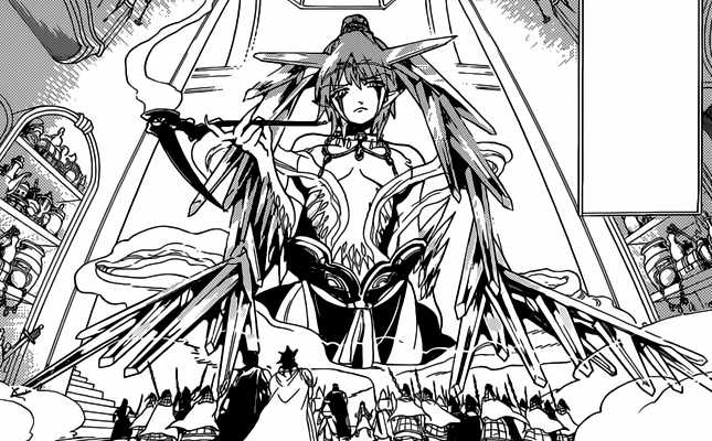 Leraje appears as a flashback from Kouha's memories. Leraje's still in her Dungeon, talking with Kouha. She tells him that if she was a normal Djinn she would choose Kouen, but since Kouen already controls three Djinn is a cheater. She adds she doesn't want to see a world ruled by a single and absolute king but a king and his strong retainers who wouldn't even lose to him and work together in order to build the world. When Kouha says that in that case he'll be part of Kouen's household Leraje contradicts him, saying he isn't fit to be the vessel for a household. She says she understand what kind of person Kouha is by looking at the eyes of his men. She thinks maybe Kouha won't end up being the king of this world because almost anyone who lives bathed in the sun probably won't choose a man like Kouha as King.[2]