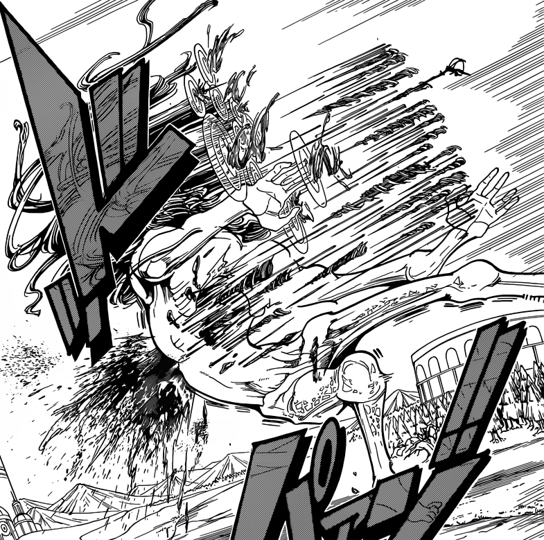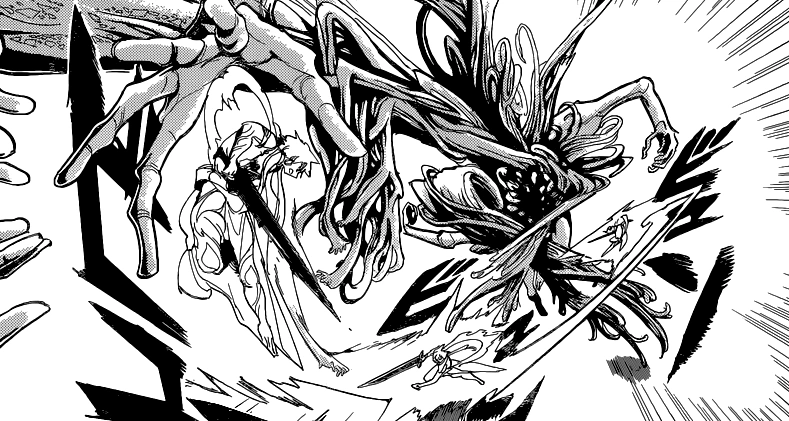 The Medium's head turns into several tens of thousands hands. With one of them, it reconnects itself with the thing in the clouds. Alibaba tries to stop it and quickly charges on the enemy. However, a Defensive Wall is created around one of hands which stops his Amol Saiqa. Alibaba starts slashing through it multiple times, but soon gets attacked by himself. The Medium tries to catch him, but he successfully runs away and dodges it for some time. However, the palm of the Medium's hand touches Alibaba's arm and strips off his Djinn Equip there. It's then able to hit Alibaba with a great strength, so Alibaba hits the ground and gets pushed by it for some meters, destroying ground. Kouen comes from behind and with his sword, touches his opponent and creates an explosion. The Medium defends with Defensive Walls created around every of its hands. It then grabs the whole body of Kouen. He releases his dragon which cuts off the hand of the rest of the arm and falls down. He ends up being hurt all over his body, with the skin of his face completely teared off. The same happens to Alibaba's arm.[13]
