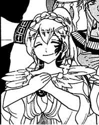 Parsine Pratemia appears along with Sinbad, Narmes Titi and Imsisika to give her support to Alibaba Saluja in order to become the King of Balbadd. She stands silently the whole time. After Alibaba's agreement with the Kou Empire is done, Parsine returns to her country on her big bird. [1]