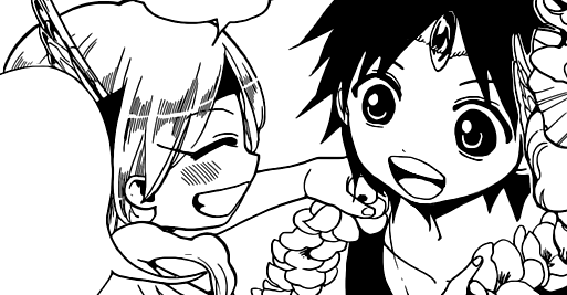 The next day, she is having a breakfast with Sharrkan, Toto, Olba, Aladdin and Morgiana. She learns that Toto isn't Alibaba's girlfriends, but Garda, a female ape, is, despite what Alibaba has said earlier. She teases Alibaba by telling him that he's a bad boy and wanting him to admit with how many girls he played in Reim. She is surprised by Alibaba's blank expression, but thinks that it hasn't affected him after all, although Sharrkan covers her mouth so she wouldn't say anything more. She briefly sighs when the guys make a scene.[21]