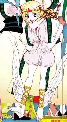 Although she is an adult, Pisti's appearance resembles a girl of a much younger age. She is short in stature and self-conscious about her small breasts, as noted when Aladdin fondles her.[3][4] She has blonde hair, which is braided on one side with a pink string, and wears a red headband where she keeps her flute, which is also her Household Vessel. She has dark pink eyes, and wears a loose-fitting, pale pink top with a slit down to her navel and matching harem pants. She also wears golden leg wraps that have wings attached to them. Otherwise, she's barefoot.