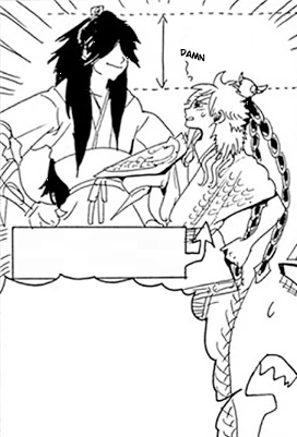 Alibaba Saluja is fighting against the Black Djinn, and is about to use his Extreme Magic to eliminate them when Shou En advances his move and destroys them with a breath of fire. After that, Kouen and the other monsters make their appearance riding carpets. Kouen analyzes the situation and, when he sees Kouha Ren's state, he says to his Household that if the the enemies are too much for the others, they will deal with them with their strength. The four monsters roar in approval.[4]