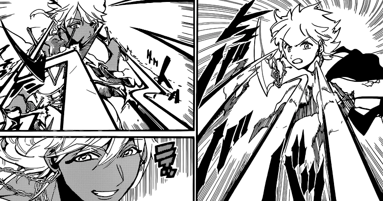 Initially Sharrkan has an advantage, but when his opponent multiplies himself using Dhell-Dhell Dhalam, he is injured in his back. After that he has no choice but to use his Household Vessel, Foraz Saiqa. He is able to defeat Byoln, but, because of his low amount of Magoi, he can't help Yamraiha with her fight, yet he notes that she wouldn't be happy if he interfered. He then stays with Alibaba and watches her fight.[18]
