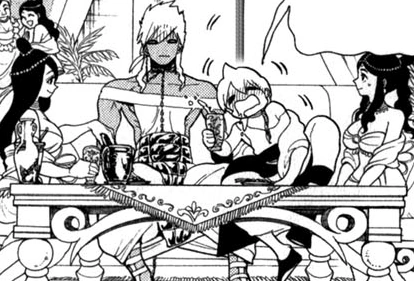 Sharrkan joins the party attended by Alibaba, Aladdin and Morgiana, drunk, accompanied by some ladies. He apologizes to Alibaba for not being able to meet him when he arrived that afternoon, as he was escorting a trading vessel. He asks him when did he get such a good expression on his face. Alibaba thanks him and notes that Sharrkan smells of alcohol in the evening. He seems amazed that Alibaba is able to retain his composure when he drinks now. Much to everyone's surprise, Sharrkan asks if Alibaba was able to become a "man" in Reim. Aladdin wants to know what he meant, but Sharrkan replies that he's still too young for that kind of talk. He explains that the noblewomen of Remano love the gladiators, which Masrur confirms and adds that this is not the kind of talk which he should have in front of Morgiana, but Sharrkan ignores it. He is quite sure that Alibaba surely met one or two. Alibaba tries to keep Toto quiet, making Sharrkan surprised by his reaction. Olba and Birgit ask if Toto is Alibaba's lover and Sharrkan inquires if possibly Alibaba really was able to get a girlfriend in Reim. When Alibaba confirms it, Sharrkan is completely shocked and dubiously asks if really.[28]