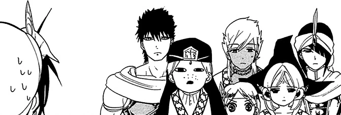 Sharrkan teases embarrassed Alibaba about flirting while others were seriously training. He listens to Alibaba's explanations about Toto and wants him to introduce Toto to him right away, though Yamraiha calmly explains why he shouldn't now. She also tries to stop him from drinking.[29]
