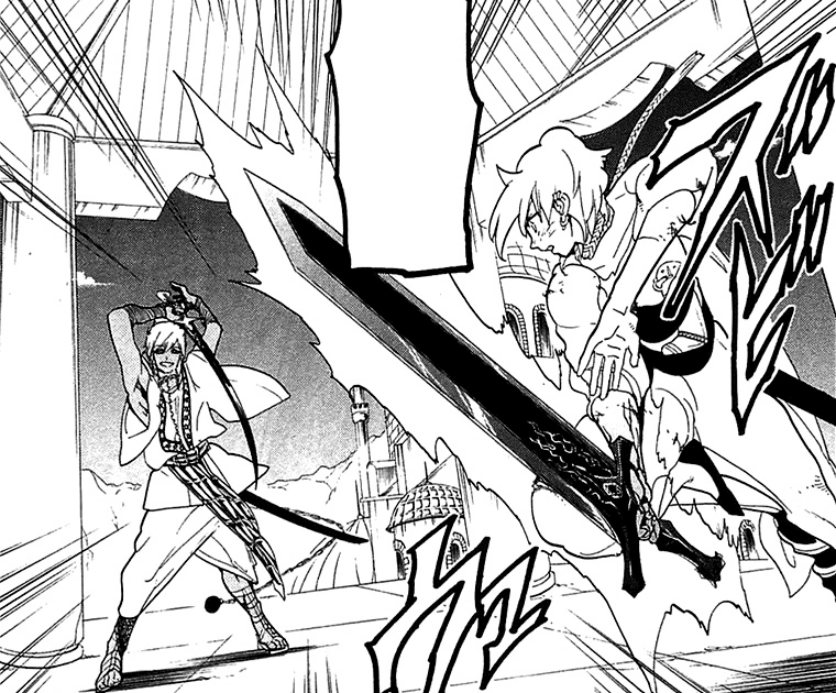 Some time later, he is training with Alibaba. He doesn't have bigger problems with him thanks to his snake style, which is hard to predict. However, to have better chances against him, Alibaba stretches his Magoi around the hilt of his sword. Sharrkan notices that it's the same technique as what his King uses, Magoi Manipulation. Alibaba explains that he was taught it in Reim by Shambal and he trained his swordsmanship with Muu Alexius. Upon hearing it Sharrkan raises his arms and jealously calls him a traitor for training with others when Sharrkan was supposed to be his sole master. After that, he starts hitting Alibaba.[31]