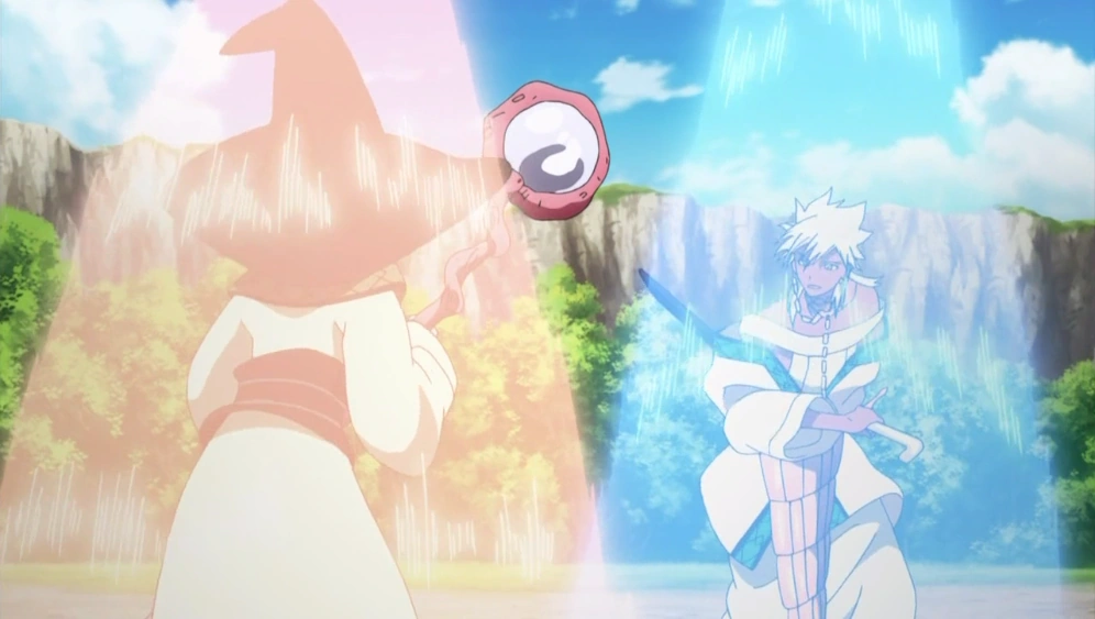 Sinbad tells Alibaba that Sharrkan will be his swordplay master. Sharrkan greets Alibaba and tells him he has heard that Alibaba is looking for a teacher to improve his fencing no matter what, and he seems happy that Alibaba understands the value of swords. Yamraiha tells Alibaba that if he hangs around Sharrkan too much he will be infected with Sharrkan's fencing idiocy. He and Yamraiha get in an argument over which is best, swords or magic, with Sharrkan on the side of the sword, and Yamraiha on the side of magic. Sinbad tells Aladdin and Alibaba that they should not depend on each other and just get stronger. Sharrkan and Yamraiha then choose to compete, by seeing whose disciple is stronger. They pull Aladdin and Alibaba away from each other. Morgiana says that she's glad she has Masrur. As they are immediately about to start training, Sinbad stops them and says to wait to tomorrow. Sinbad says that tonight they have to celebrate.[6]