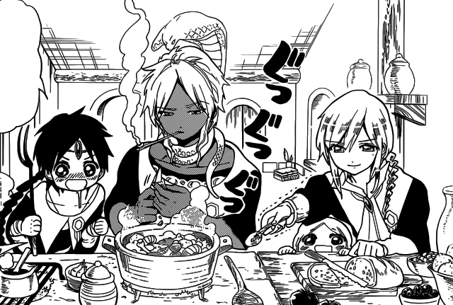Sphintus, Aladdin, Titus, and Marga spend a day together, and when he's playing with Marga he can't follow her rhythm. Aladdin tells him to do his best, but Sphintus, while coughing, only angrily orders him to be quiet. He then falls on Aladdin, exhausted, and complains that it's too much. He says that he can't follow her anymore and notes that she's so full of energy lately. Titus smiles and says that scheduled "treatments" are working. Sphintus comments that Mogamett is incredible. Aladdin gets pissed that Sphintus is still lying on him and orders him to move. Sphintus gets hit by Aladdin's comment that he's cool only when it comes to using Healing Magic. Then, he cooks and Titus, while snatching the food, says that Sphintus is, surprisingly, a good cook. Sphintus blushes but tells him to shut up, since it's his specialty. Then, he mentions that Titus should pay him medical fees, since he saved him once. Titus comments that he's a really stingy fellow, but Sphintus orders him to shut up. He says that if he complains, he will make his way into his family once he finishes the lesson, so after a year or two. Upon hearing it, Aladdin starts saying that the Reim Empire sounds nice and one of his friends is doing his best there. Sphintus says, "The talk about the mysterious Alibaba again," and Aladdin promises to introduce him to Sphintus the next time. The group then starts eating and fooling around. After that, Sphintus and Aladdin head to the bed in Titus' and Marga's apartment.[24]