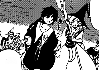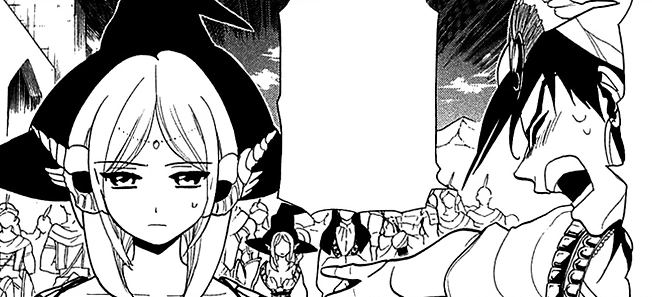 Afterwards, she listens to the conversation between Sinbad and Kouen Ren. When Kouen decides to take Aladdin with him, she first is surprised, but quickly starts panicking, terrified about what to do.[39]